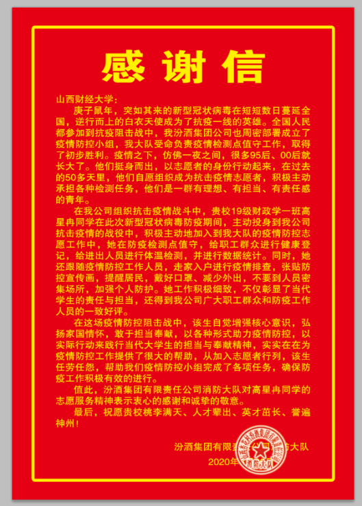 近日,EMC易倍体育经济公司收到了来自汾酒集团消防大队的感谢信,信中写到:贵校2019级员工高星冉勇于担当,乐于奉献,为疫情防控做了大量的工作,彰显了新时代青年的责任与担当。