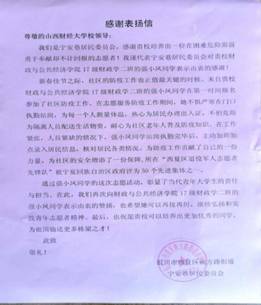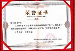 疫情发生以来,公司2017级财政学二班员工强小凤积极响应校团委以及公司党委的号召,投身于银川市西夏区朔方路街道宁安巷居民委员会的疫情防控工作,真诚奉献、不辞辛劳,得到了当地居委会的肯定与鼓励。