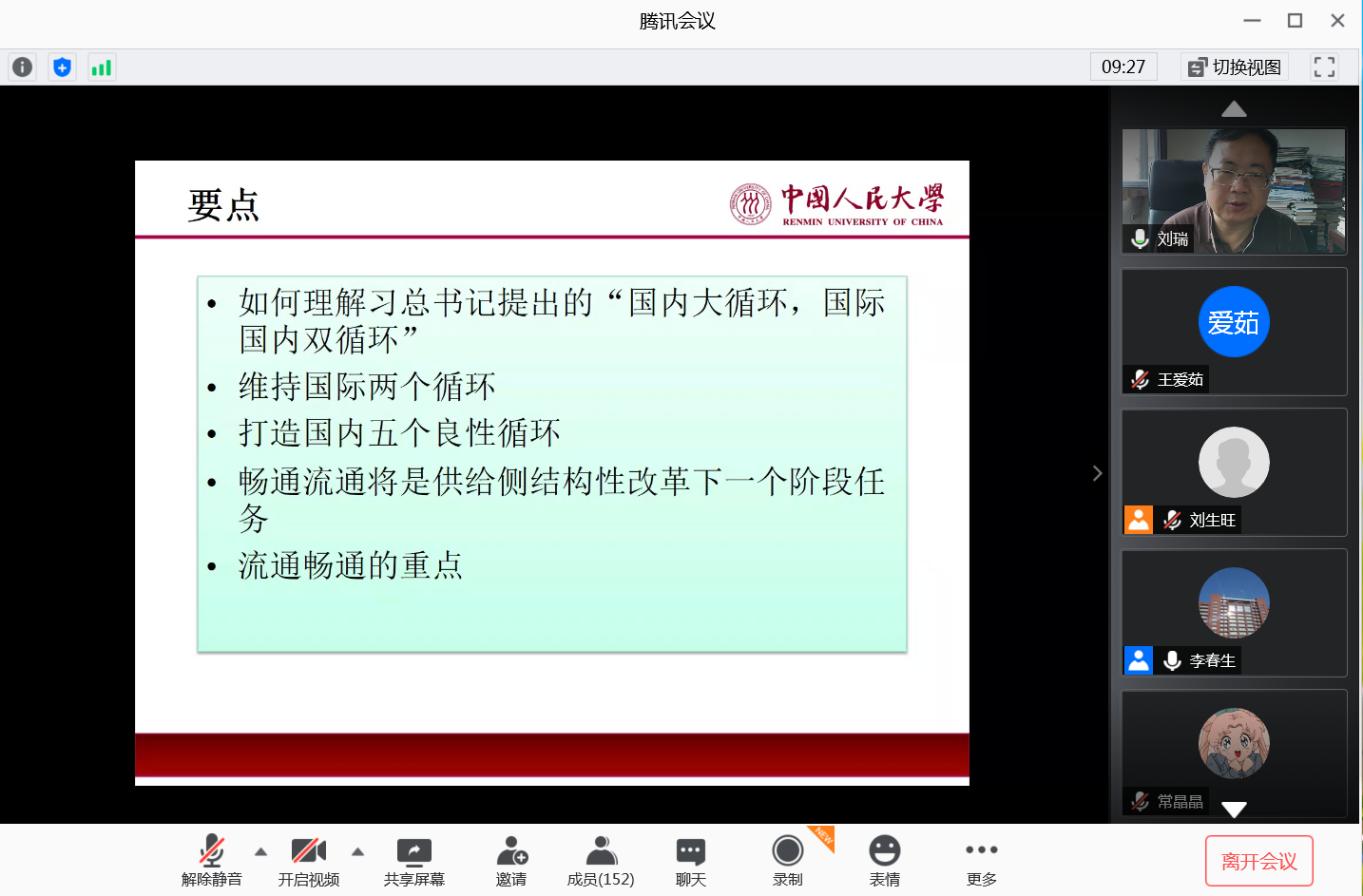 2020年9月27日上午9:00,EMC易倍体育第5期EMC易倍官方网站70周年校庆系列学术讲座在腾讯会议线上成功举行。本次活动由EMC易倍体育举办,活动主题为“中国“双循环”新格局的构想及重点”,由中国宏观经济管理教育学会会长、中国人民大学经济公司副经理——刘瑞教授主讲。其中,EMC易倍体育刘生旺、赵文生经理以及各位老师出席了此次活动,共156名学子参与。