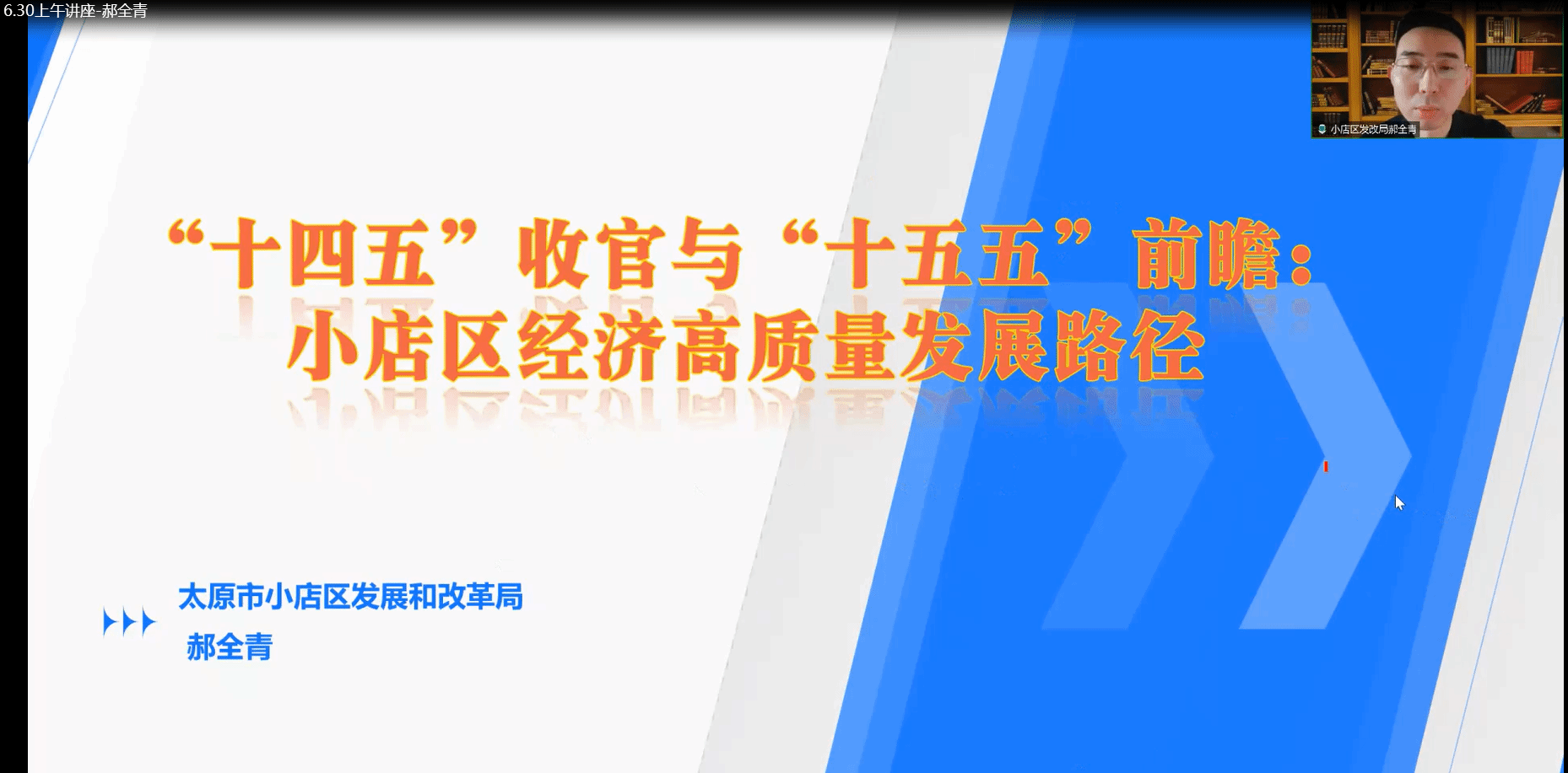 在6月30日上午的“十四五”收官与“十五五”前瞻:小店区经济高质量发展路径的讲座中,小店区发展与改革局的郝全青同志向我们展示了小店区目前的形势、机遇及挑战。在总体要求中,指出要主动服务和融入新发展格局,进一步深化改革,着力扩大开放,深入实施“七区”战略,高质量完成“十四五”规划目标任务等。在面临挑战中指出目前创新能力不足,民生保障、生态环境改善还需进一步巩固拓展等。在发展机遇中指出有政策优势,全省经济整体向好等。对于做“精”一产、做“大”二产、做“优”三产的措施作出详细介绍。在最后展示太原市“六地”发展定位和深入实施“七区”战略主要有哪些内容。