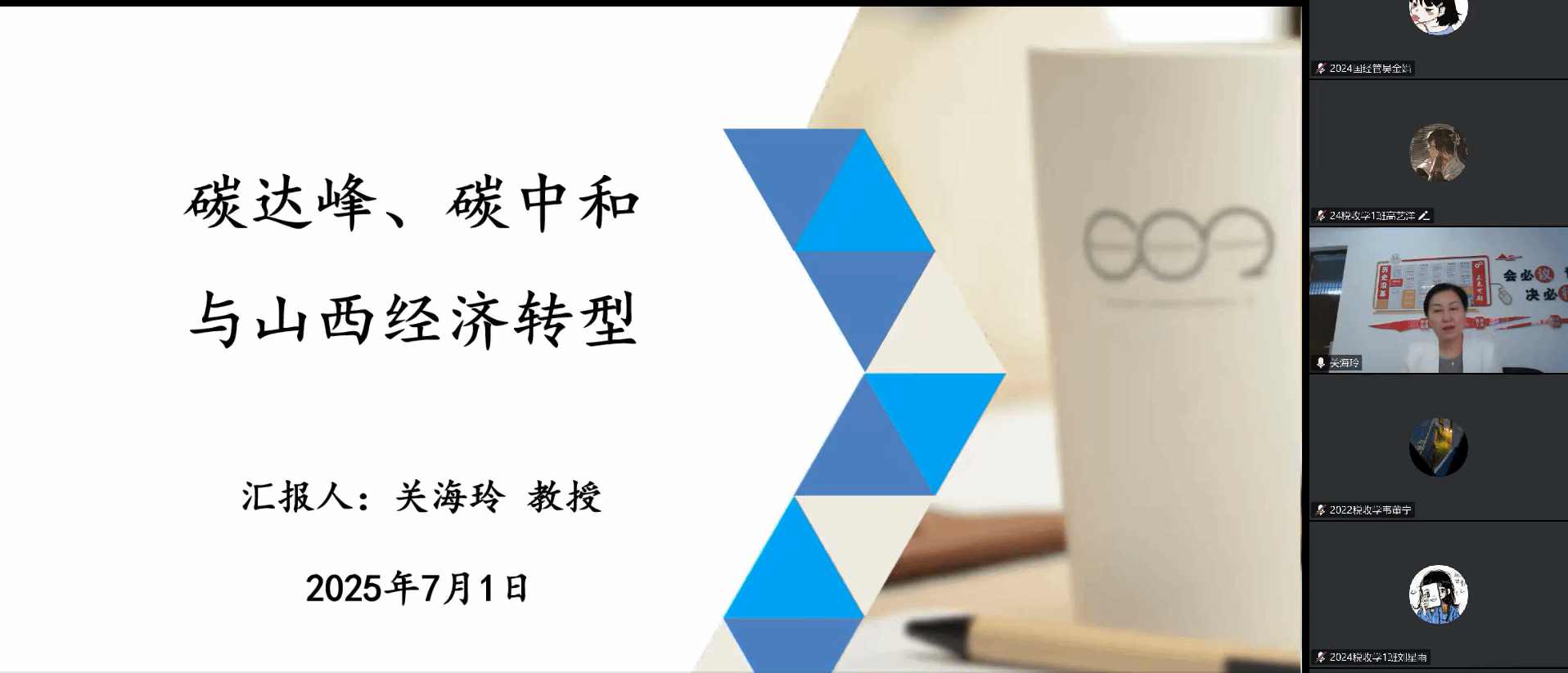 在7月1日上午的碳达峰、碳中和与山西经济转型的讲座中,太原科技大学关海玲教授从六个方面具体阐述内容。其中在“双碳”目标:国家战略与山西定位方面,2021年10月24日,国务院印发了《关于完整准确全面贯彻新发展理念做好碳达峰碳中和工作的意见》,该意见明确了实现碳达峰、碳中和是党中央的重大战略决策,提出了全国统筹、节约优先、双轮驱动、内外畅通、防范风险的工作原则,并设定了到2025年初步形成绿色低碳循环发展的经济体系等主要目标。而后关教授详细阐述了碳达峰和碳中和的定义,解释了它们在应对气候变化中的重要性,并比较了二者在实现路径和目标上的异同。对关于山西定位,实行的政策方针和行动措施也进行了展示。关教授还列举了几个国外城市和国内城市对于碳达峰碳中和的实行措施。在山西路径:从“减法”到“加法”的系统变革的角度中,指出“减法”抓手(工业领域)和“加法”举措(能源结构),还向我们说明了CCUS技术是实现零碳排放的最佳路径以及推动该技术产业化的建议。最后关教授指出碳达峰、碳中和与经济转型的实现是一个系统性工程,涉及多个领域,首先要做好顶层设计,分解目标、落实责任,然后要以各类试点示范为抓手切实落地并探索先进做法,通过制度创新手段协同推进,打造高端交流合作平台,助力碳达峰、碳中和与经济转型。