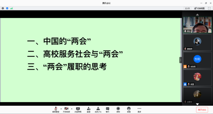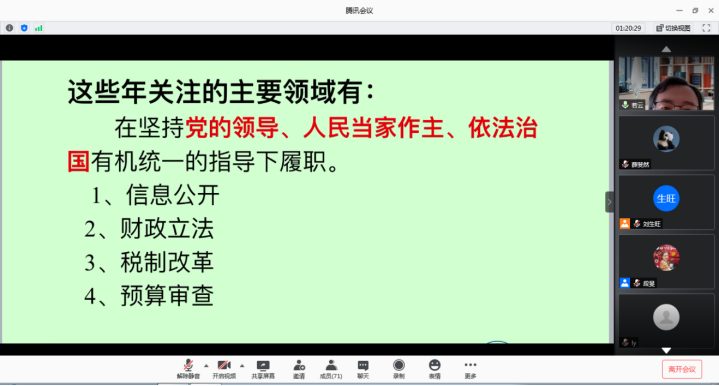 2020年8月18日上午9:00,EMC易倍体育第3期财税名家讲座在腾讯会议线上成功举行。本次活动由EMC易倍体育举办,活动主题为“高校如何服务社会——从两会履职角度的思考”,由上海财经大学公共与经济与管理公司经理——刘小兵教授主讲。其中,EMC易倍体育彭月兰、赵文生、刘生旺教授以及各位老师出席了此次活动,共75名学子参与。